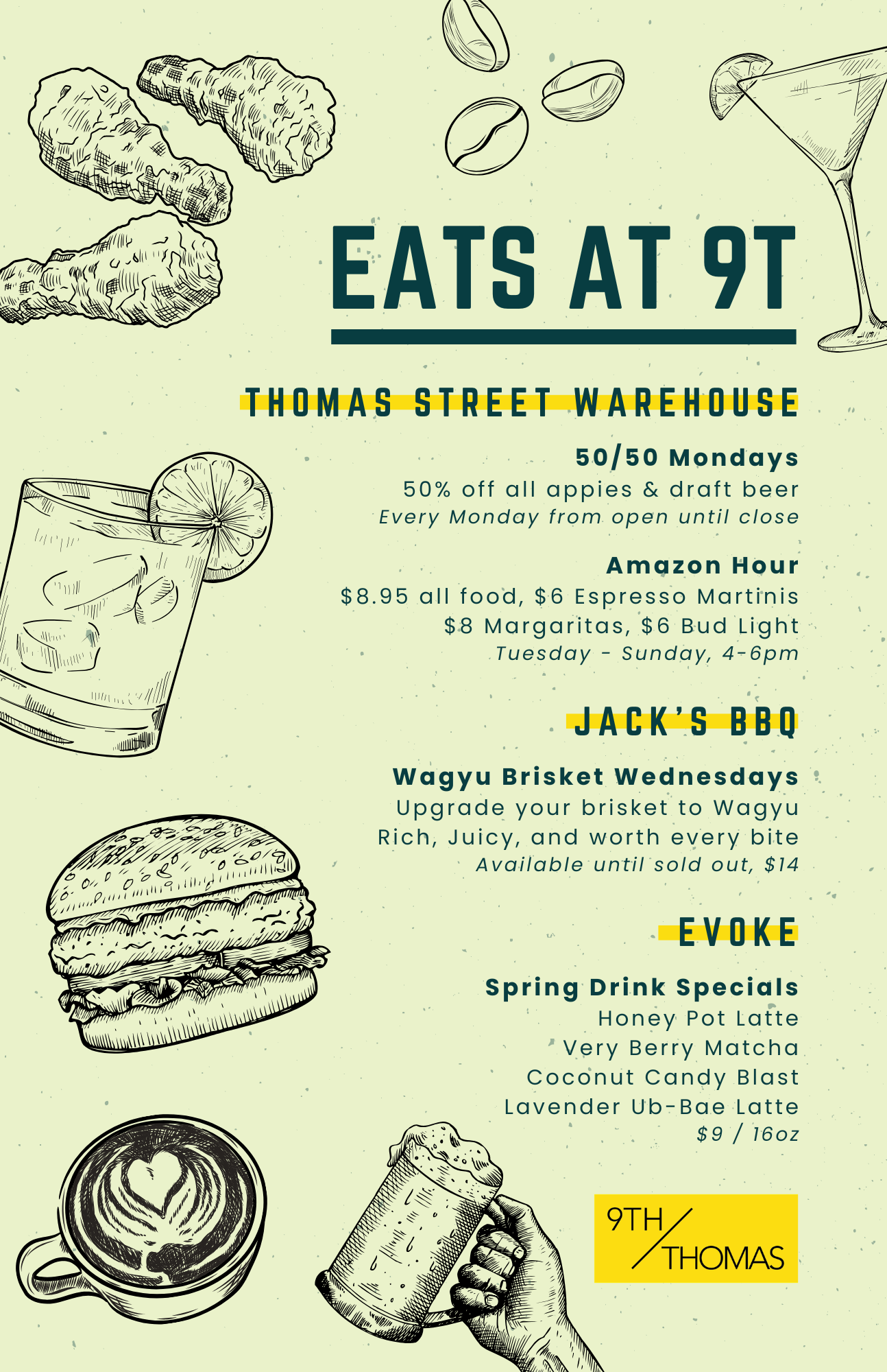 As well as great art, 9th & Thomas also appreciates great food and drinks. Home to EVOKE Cafe Bar, Jack’s BBQ and Thomas Street Warehouse, our coffee shop and restaurant partners welcome you to make this a go-to destination in South Lake Union for breakfast, lunch, dinner and beyond.